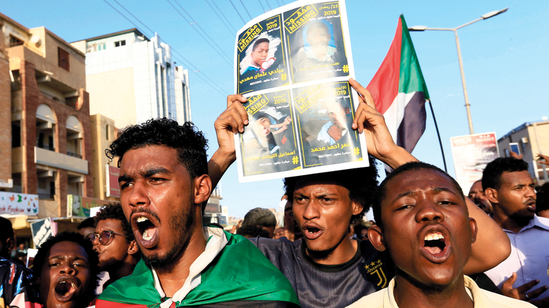 سودانيون خلال تظاهرة سابقة في الخرطوم تطالب بحل «حزب البشير». رويترز
