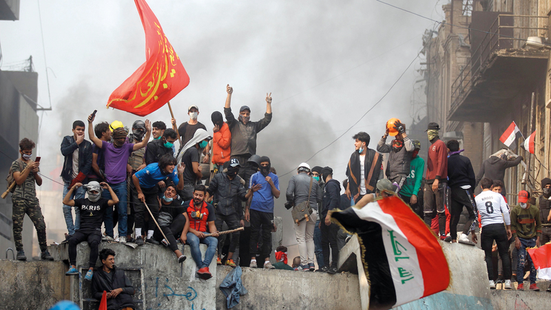 متظاهرون عراقيون يعبّرون عن فرحتهم في بغداد بعد إعلان عبدالمهدي نيّته الاستقالة. أ.ف.ب