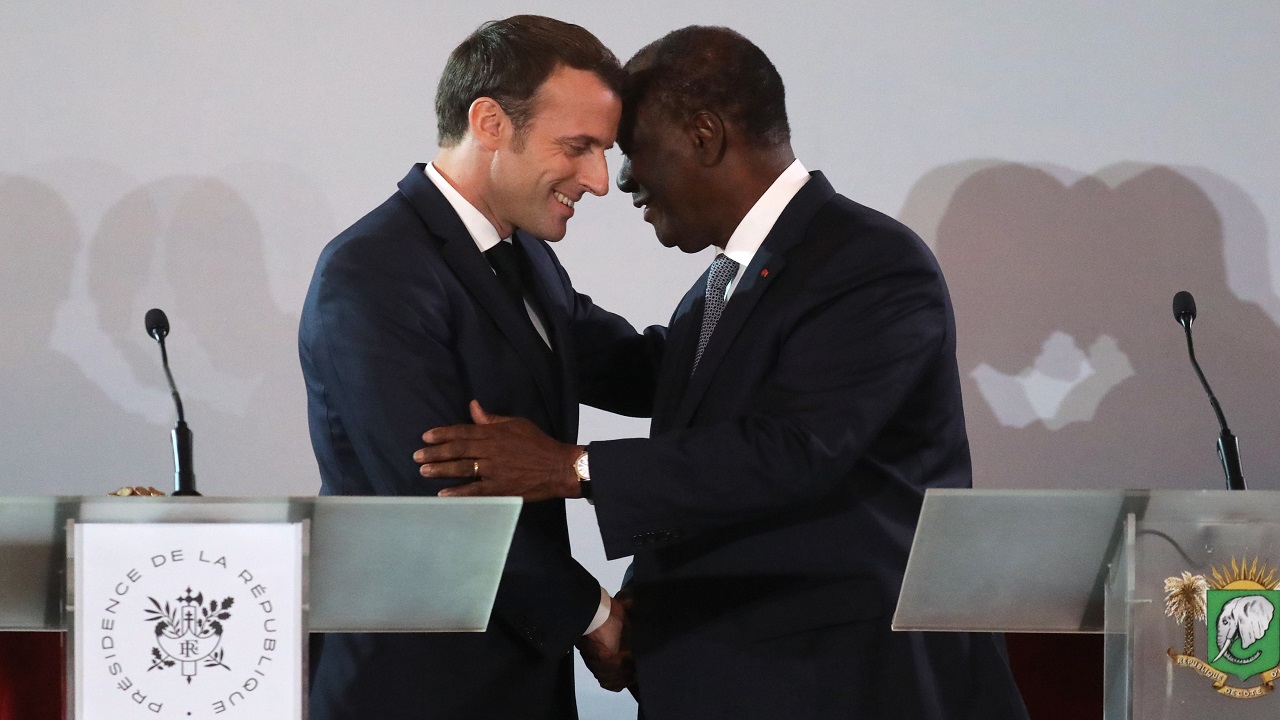 ماكرون مع مع نظيره العاجي الحسن وتارا (أ. ف. ب)