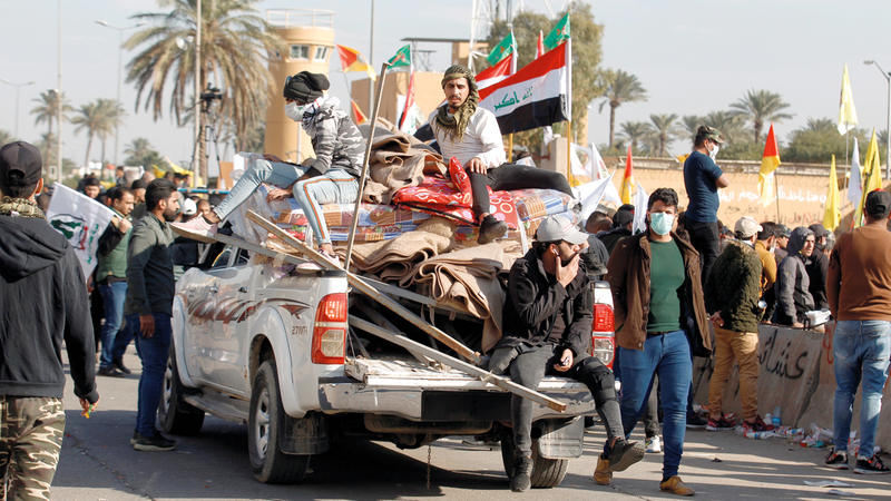 متظاهرون وعناصر من الميليشيات خلال انسحابهم من محيط السفارة الأميركية في بغداد بعد فك خيام الاعتصام. رويترز