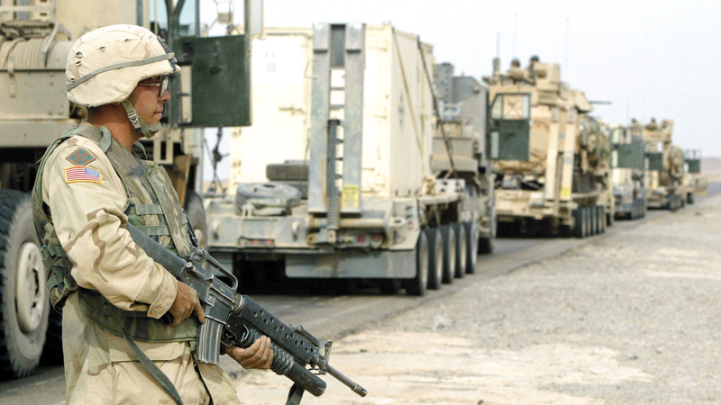 جندي أميركي ضمن التحالف الدولي في العراق يقف بجانب رتل من السيارات العسكرية. ■ إي.بي.إيه