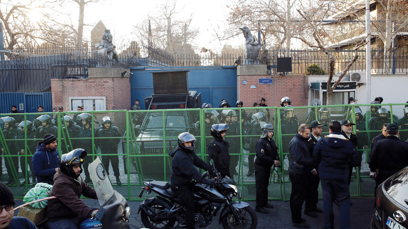 شرطة مكافحة الشغب أمام السفارة البريطانية في طهران لحمايتها من المتظاهرين. إي.بي.إيه