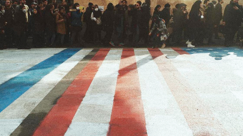 ورسْم عَلمي الولايات المتحدة الأميركية وإسرائيل على الأرض لكي يكونا تحت الأقدام منتشرٌ بإيران في إطار الدعاية التي يطلقها النظام لإظهار العداء ضد البلدين. طهران ■وكالات