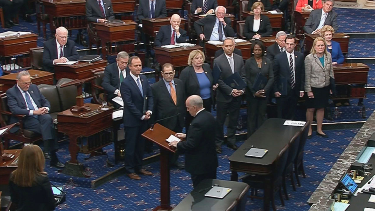 وترأس الجلسة السيناتور البارز تشاك غراسلي، الذي دعا المدعين السبعة المعينين من مجلس النواب، بقيادة النائب آدم شيف، ثم تلا شيف الاتهامين بالتقصير.