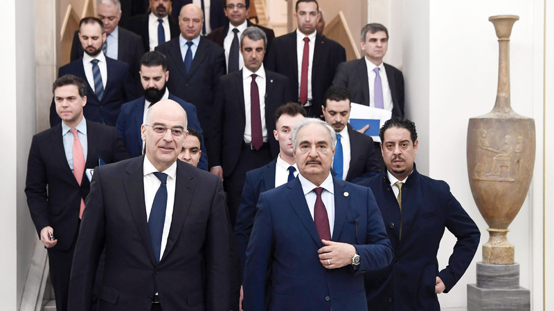 وزير خارجية اليونان نيكوس دندياس والمشير خليفة حفتر بعد مباحثاتهما في أثينا. أ.ف.ب