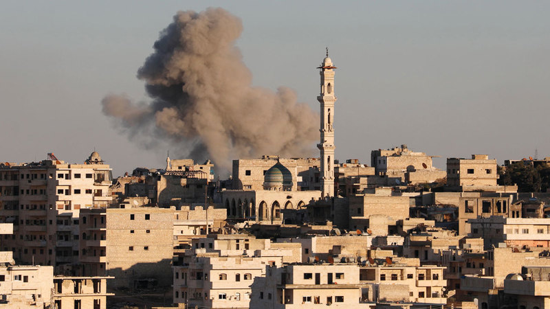 دخان القصف يتصاعد فوق المباني بمدينة معرة النعمان. أ.ف.ب