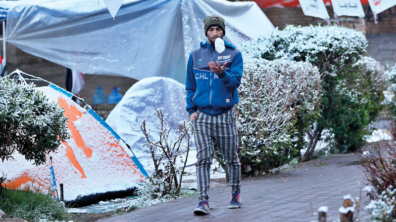 الثلوج تغطي خيم المعتصمين من المتظاهرين في ساحة التحرير ببغداد. أ.ب