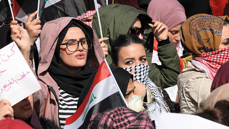 عراقيات خلال تظاهرة احتجاجية في ساحة التحرير وسط بغداد.■ أ.ب