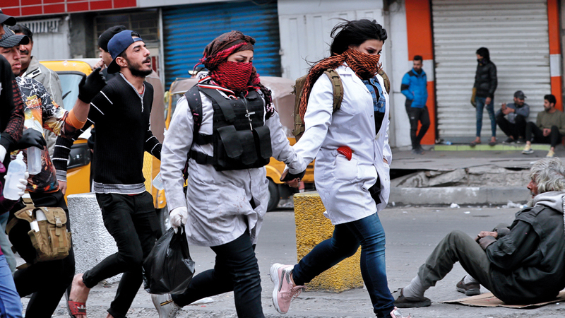 متظاهرون يفرون خلال مواجهات مع قوات الأمن في قلب بغداد. أ.ب