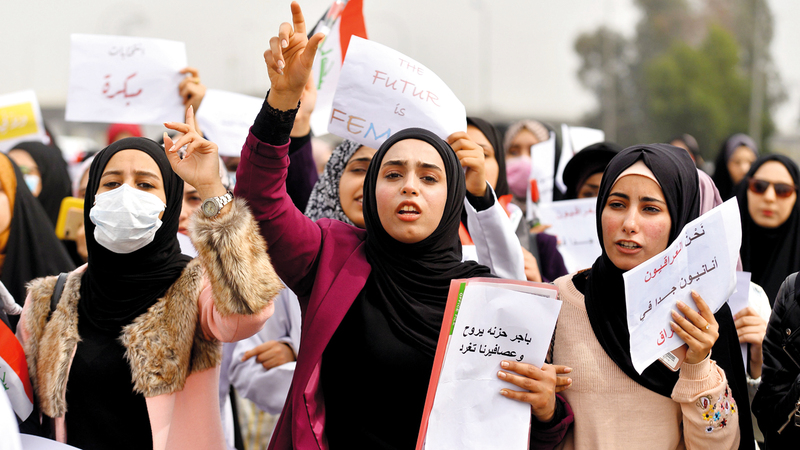 يأتي ذلك في وقت خرجت مئات النساء، أمس، في تظاهرة نسوية هي الأولى في مدينة النجف جنوب بغداد، للدفاع عن دورهن وتأكيد حقوقهن بالمشاركة في الاحتجاجات المناهضة للحكومة، المطالبة بإصلاحات سياسية شاملة، وانطلقت منذ أكتوبر.