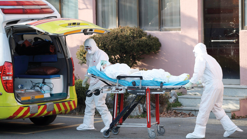عاملون طبيون ينقلون أحد المصابين بـ«كورونا» المستجد في كوريا الجنوبية. ■ أ.ف.ب