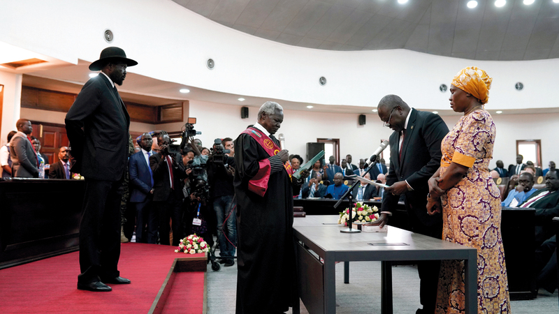 أقسم زعيم المتمردين في جنوب السودان رياك مشار اليمين، أمس، في جوبا ليتولى منصب نائب الرئيس، ويلتحق بالسلطة رسمياً، وقال مشار أمام جمهور من الدبلوماسيين وممثلين لدول الجوار، من بينهم رئيس مجلس السيادة السوداني الفريق أول عبدالفتاح البرهان: «أقسم أن أكون وفياً لجمهورية جنوب السودان». وجاء القسم بعد اتفاق ريك مشار مع رئيس جنوب السودان سلفا كير، على تشكيل حكومة وحدة، في خطوة من شأنها إنهاء القتال المستمر في البلاد منذ سنوات. وأجل كير ومشار أكثر من مرة موعد تشكيل حكومة الوحدة الوطنية بعد اتفاق سلام وقعاه عام 2018، وأودت الحرب الأهلية بحياة 400 ألف شخص.