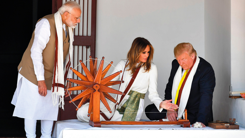 ترامب وزوجته برفقة مودي في المقر الرئيس للمهاتما غاندي. أ.ف.ب
