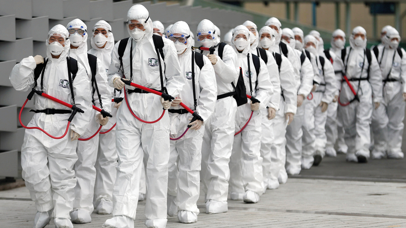 جنود من الجيش الكوري الجنوبي بملابس واقية خلال عمليات تطهير في إحدى محطات السكة الحديد للوقاية من «كورونا». أ.ف.ب