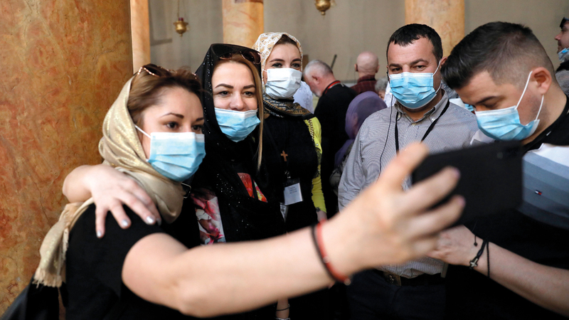 سائحون يلتقطون صوراً وهم يرتدون أقنعة واقية أثناء زيارتهم لكنيسة المهد في بيت لحم. ■ إي.بي.إيه