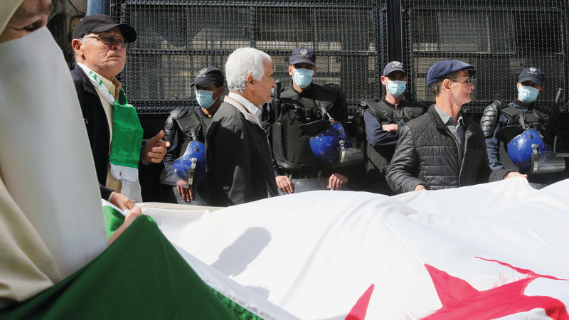 متظاهرون في الجزائر يحيط بهم رجال الشرطة أول من أمس. رويترز