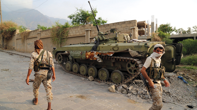 مقاتلان من الجيش اليمني بجوار دبابة حوثية مدمرة. أرشيفية