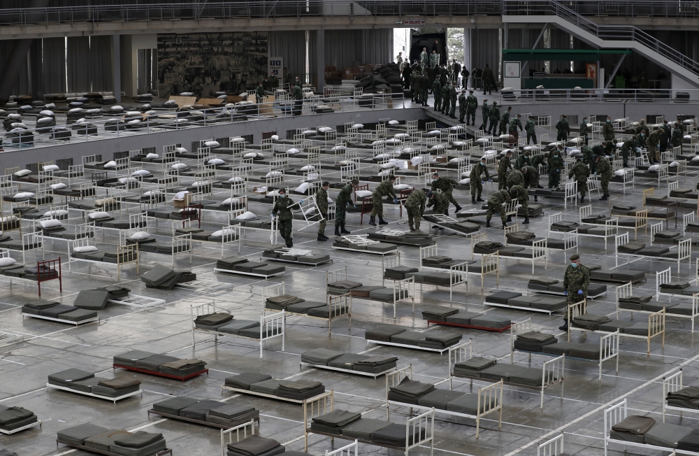 وذكرت قناة «آر.تي.إس» التلفزيونية الرسمية أن أول 10 أشخاص مصابين، لكن لا تظهر عليهم أي أعراض حادة، أستقروا في القاعة المزودة بقبة وتبلغ مساحتها 21300 متر مربع، مليئة بأكثر من 3000 سرير.