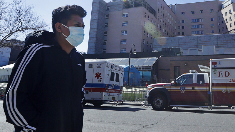 أميركي يمر أمام أحد المستشفيات في نيويورك أكثر الولايات تأثراً بالفيروس. أ.ب