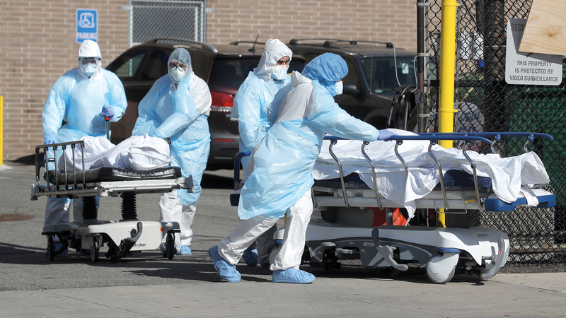 عاملو الرعاية الصحية ينقلون جثث متوفين في نيويورك. ■ رويترز