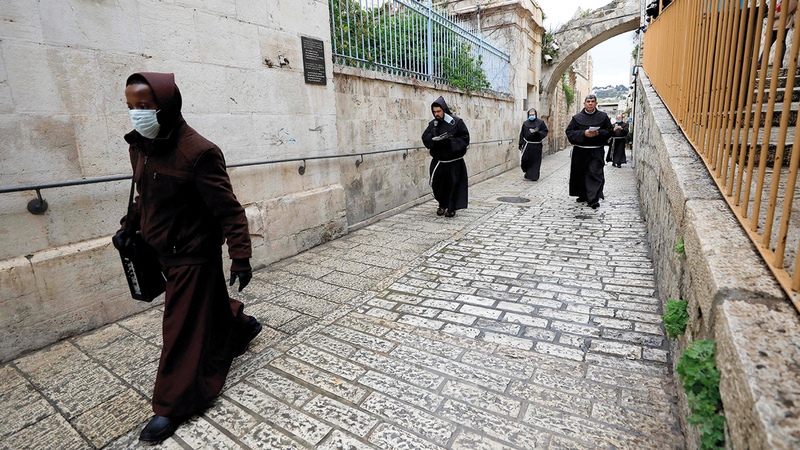 رهبان يسيرون في موكب صغير بمناسبة «الجمعة العظيمة» في القدس المحتلة مرتدين كمامات. ■أ.ف.ب