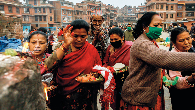 عدد قليل من «المخلصين» يتجمّعون لتأدية الصلاة على الرغم من تفشي فيروس كورونا، خلال الاحتفال بمهرجان بيسكا الذي يتزامن مع بدء العام النيبالي الجديد.
