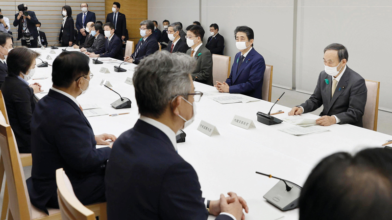 رئيس الوزراء الياباني شينزو آبي (وسط) خلال إعلانه توسيع الطوارئ.■ أ.ب
