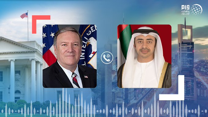 بحث سمو الشيخ عبدالله بن زايد آل نهيان وزير الخارجية والتعاون الدولي خلال اتصال هاتفي مع وزير الخارجية الأميركي مايك بومبيو علاقات الصداقة والتعاون الاستراتيجي بين البلدين في المجالات كافة إضافة إلى عدد من القضايا الإقليمية والدولية ذات الاهتمام المشترك ومنها اليمن وليبيا والسودان.