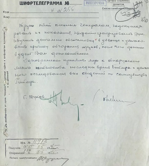 نشرت الجمعية التاريخية العسكرية الروسية بحسب «سبوتنيك» تقريرا بتاريخ 3 مايو 1945 من قائد الجبهة البيلاروسية الأولى، المارشال غيورغي جوكوف، إلى القائد العام للقوات المسلحة السوفيتية جوزيف ستالين حول البيانات التي حصلت عليها المخابرات العسكرية السوفيتية فيما يتعلق بانتحار الرايخ الثالث أدولف هتلر ووزير الدعاية السياسية يوزف جوبلز.