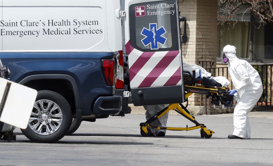 سيارة إسعاف تنقل أحد المصابين بفيروس كورونا في نيوجيرسي. (رويترز)