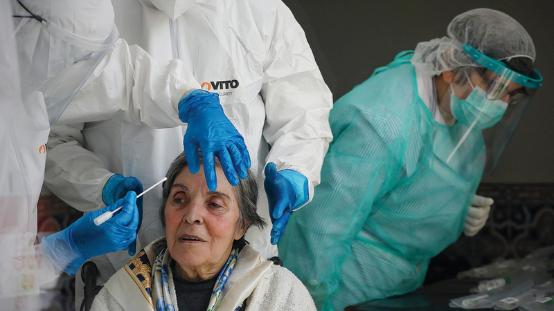 امرأة تخضع لاختبارات فحص «كورونا» بدار رعاية في سانتا ماريا دا فيرا بالبرتغال. À إي.بي.إيه