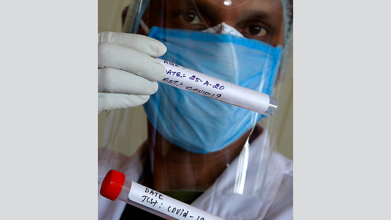طبيب هندي يعرض عينات تم جمعها قبل إجراء الاختبار الروتيني لـ«كورونا» في مستشفى في بنغالور. إي.بي.إيه