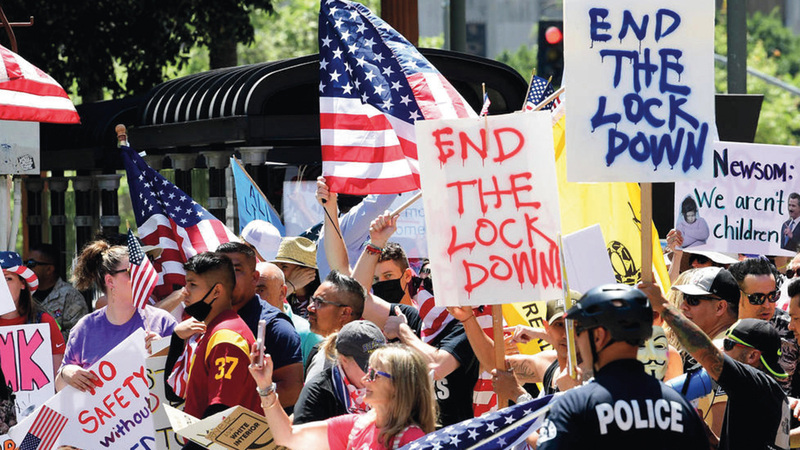 وغالبية المتظاهرين الذين كان عدد كبير منهم يهتفون «افتحوا كاليفورنيا» و«حرية» أو يقرعون أجراساً، لم يرتدوا أقنعة واقية ولم يلتزموا بقواعد التباعد الاجتماعي.