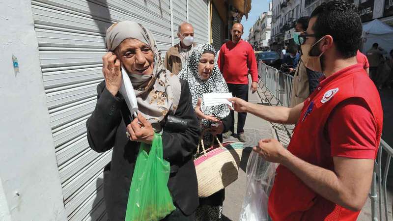 توزيع أقنعة مجانية أمام السوق المركزي في تونس. إي.بي.إيه