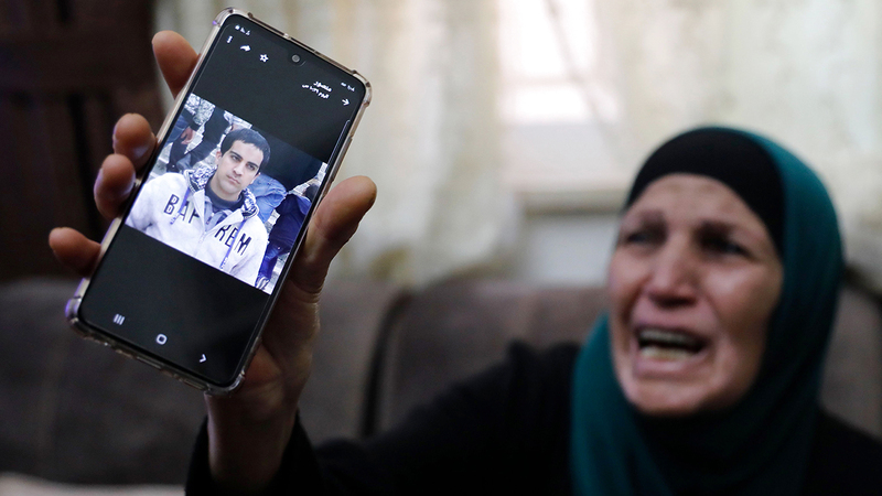 والدة الشهيد تمسك بهاتف محمول عليه صورته. أ.ف.ب