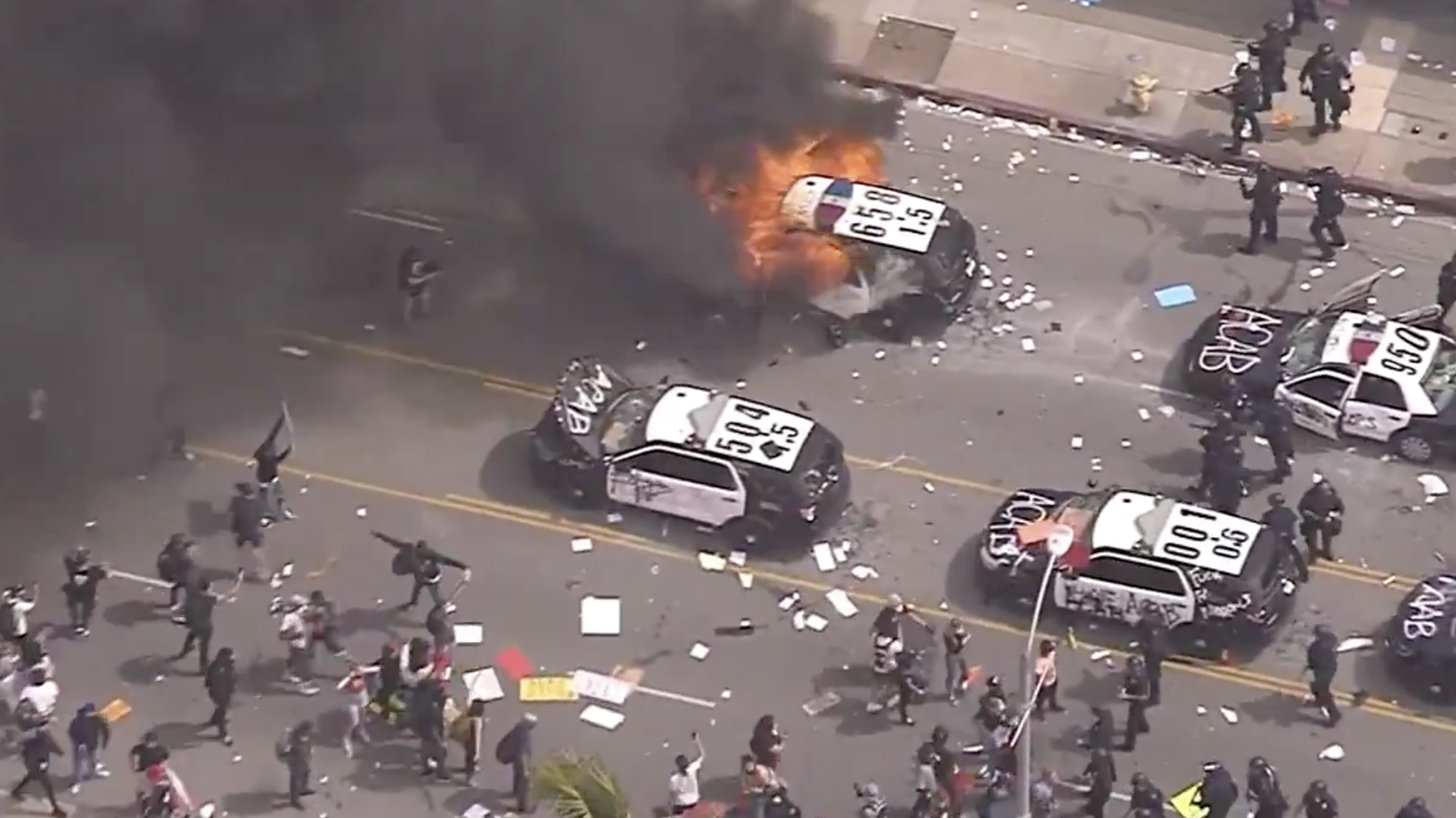 وفي لوس أنجلوس، أطلق عناصر الشرطة الرصاص المطاطي خلال مواجهة مع متظاهرين اضرموا النار في سيارة للشرطة.