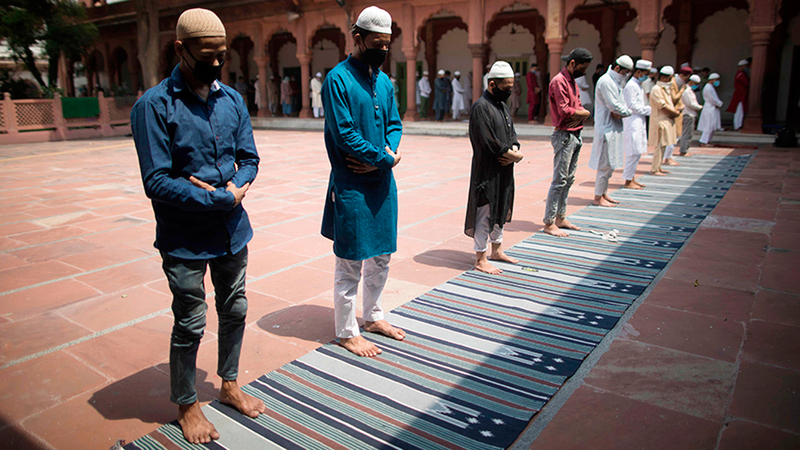 مسلمون يؤدون صلاة الجمعة في نيودلهي عقب تخفيف إجراءات الحظر. ■أ.ف.ب