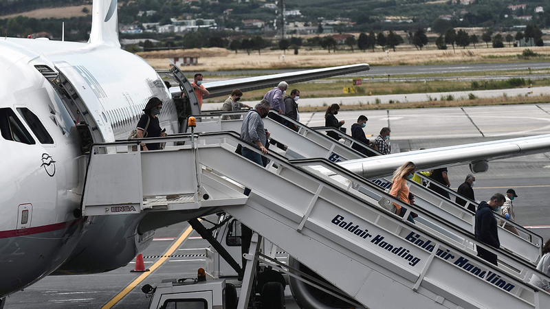 ركاب طائرة قادمة من ألمانيا يصلون إلى اليونان أمس.أ.ف.ب