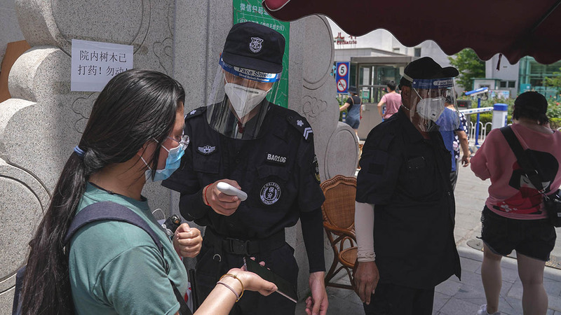 حارس أمن يفحص حرارة الأشخاص في بكين. إي.بي.إيه