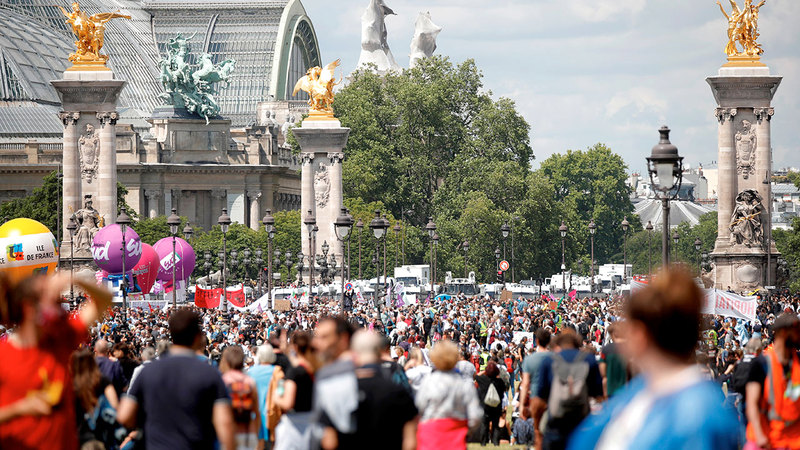 عاملون في القطاع الصحي بفرنسا يتظاهرون طلباً لتحسين أجورهم في وقت يهدّد «كورونا» حياة الملايين عبر العالم. رويترز