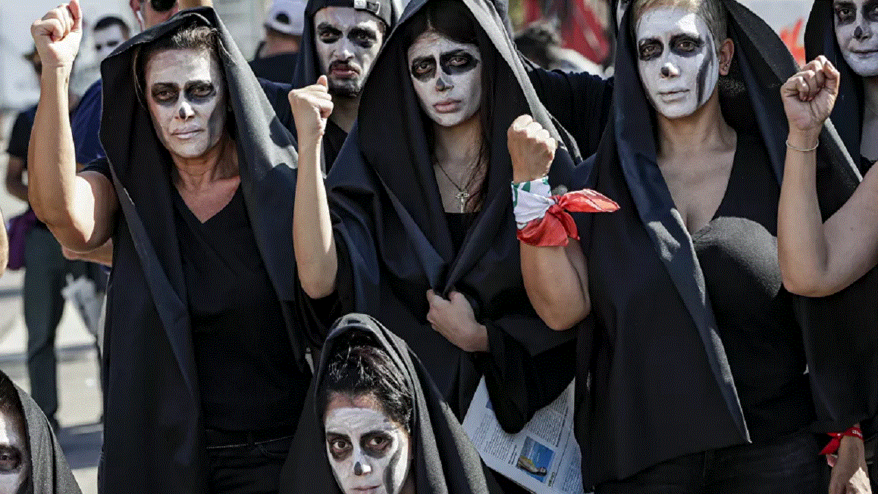 لبنانيات اتشحن بالسواد وسط بيروت خلال جنازة رمزية تعبيراً عن تدهور أوضاع البلاد. أرشيفية