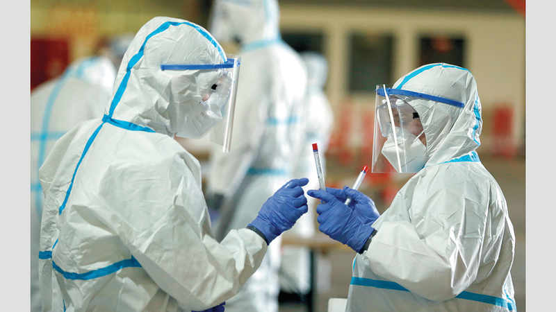 طاقم طبي في موقع اختبار بمطار غويترسلوه بألمانيا بعد تفشي فيروس «كورونا» في المدينة. رويترز