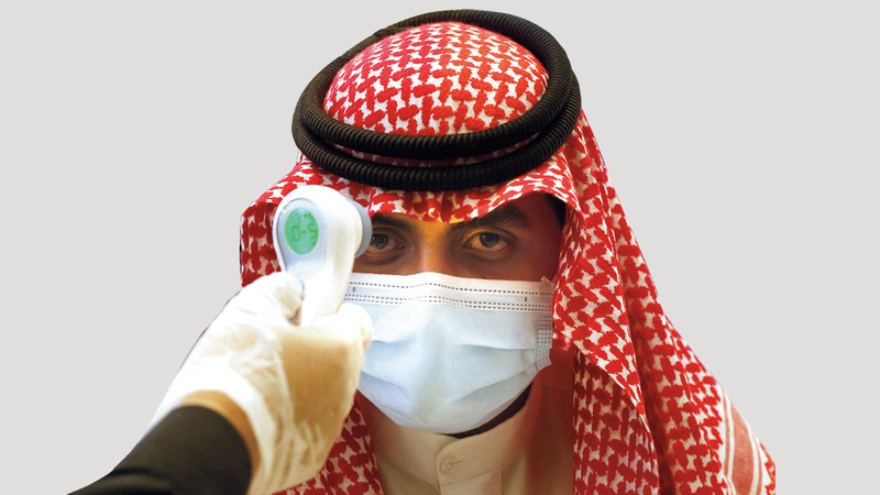 قياس درجة حرارة زائر لمركز تجاري في جدة. أ.ب