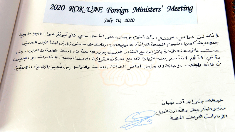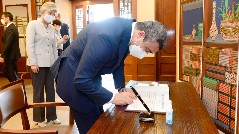 وأعرب سمو الشيخ عبدالله بن زايد آل نهيان عن سعادته وتشرفه، كونه أول وزير خارجية يزور كوريا الجنوبية منذ تفشي جائحة «كوفيد - 19»، مؤكداً على العلاقات الاستراتيجية الخاصة التي تجمع بين دولة الإمارات وكوريا الجنوبية، وما يجمعهما من شراكة استراتيجية أثمرت العديد من المنجزات في العديد من المجالات.