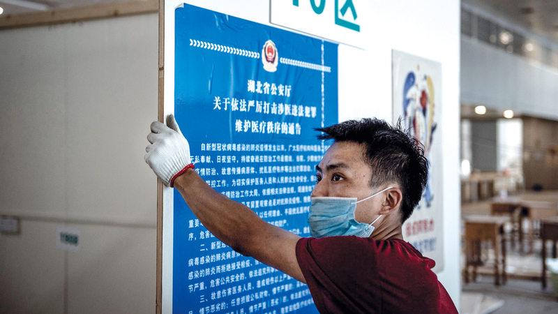 عامل يهدم منشآت في أول مستشفى مؤقت في ووهان تم بناؤه لعلاج المصابين بـ«كورونا». أ.ف.ب