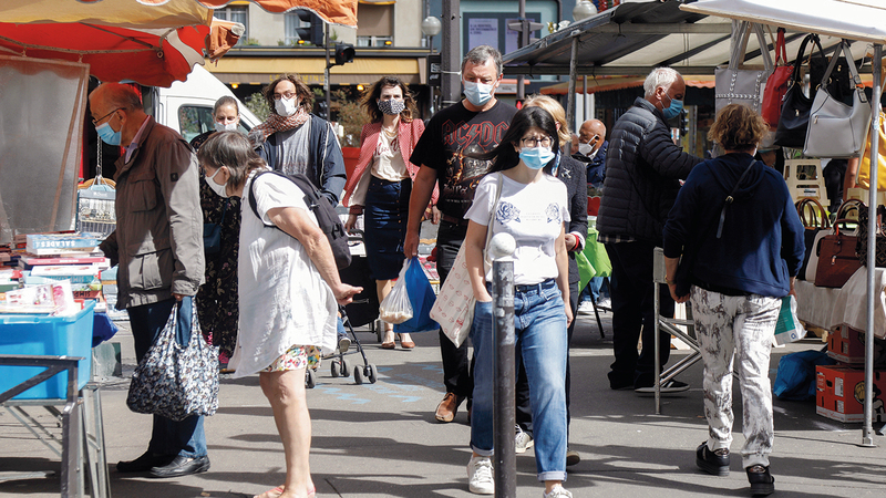 متسوقون يرتدون الكمامات في سوق في الهواء الطلق بباريس بعد فرض الأقنعة كجزء من جهود مكافحة كورونا. رويترز