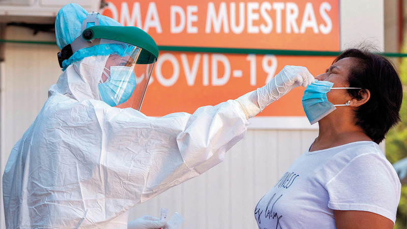 امرأة تجري اختبار «كورونا» في بلدة جوميلا بمنطقة مورسيا شرق إسبانيا. إي.بي.إيه