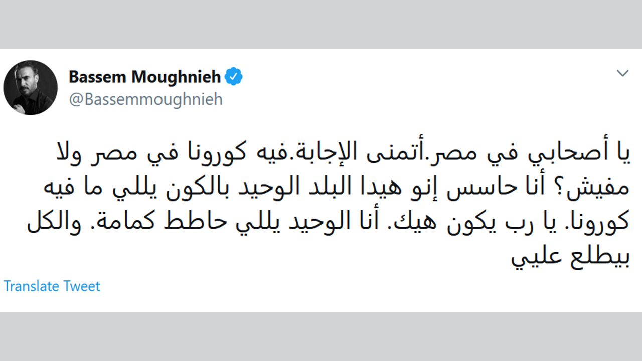 وسأل مغنية عبر حسابه بموقع التواصل الاجتماعي "تويتر": "يا أصحابي في مصر.أتمنى الإجابة. فيه كورونا في مصر ولا مفيش؟ أنا حاسس إنو هيدا البلد الوحيد بالكون يللي ما فيه كورونا. يا رب يكون هيك. أنا الوحيد يللي حاطط كمامة. والكل بيطلع عليي".