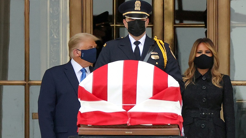 ووقف ترامب، وهو يرتدي كمامة سوداء بصحبة زوجته ميلانيا، قريبا من النعش في مبنى المحكمة الرخامي وسط صيحات الاستهجان وهتافات تقول "صوتوا لخروجه!" من البيت الأبيض، في إشارة إلى الانتخابات الرئاسية المرتقبة في الثالث من نوفمبر المقبل.