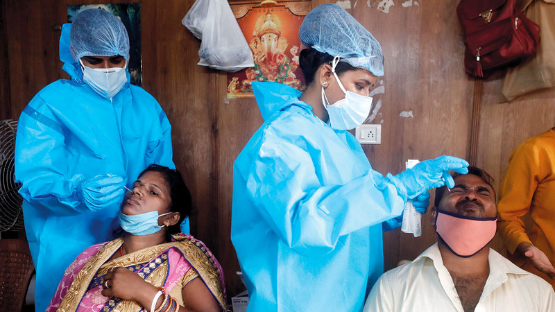 ممرضون يجمعون عينات مسحة لفحص كورونا من عائدين في محطة سكة حديد بضواحي مومباي. ■رويترز